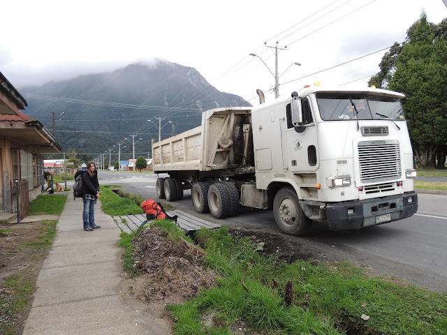 A la mañana siguiente cambió la suerte y una camionero llamado Miguel, que sólo escuchaba dos canciones de bachateo, "porque eran las que le gustaban" nos recogió en su camión de carga del año de Matusalén, sin suspension, porque tal y como nos comentó el "este camión no está hecho para esto, sino para carretera", y con el remolque a media carga de piedras, puesto que asi bota menos... y así recorrer durante nueve horas el camino austral... Pufff... El lugar y las vistas increíbles, te da la sensación de que estas en un territorio virgen de humanos, y la experiencia de hacerlo en un camión de carga, a la misma altura! En un punto en el que el camión no podía subir una cuesta tuvimos que ser empujados por una retro excavadora de brazo largo, porque sino no subimos... Lo que os digo, la caña!