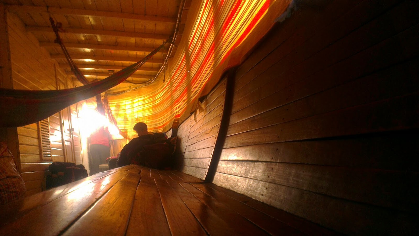 Llegada la noche me tumbé en la hamaca, no sin cierta dificultad, lo que supuso las risas de mis nuevos compañeros de viaje, que debajo de mi, durmiendo tirados en el suelo del barco (tan solo el jefe de ellos, un tipo que había aparecido bastante poco en escena sin pronunciar muchas palabras) tenía camarote. El caso es que me fui dejando mecer en un agradable sueño que solo se vio interrumpido cuando de la nada, me cayó una lata de cerveza vacía que evidentemente me despertó, al analizar la situación y llegar a la conclusión de que solo había podido ser el jefe del grupo, ya que, junto con otro de los cinco con los que había estado hablando y con el que había hecho buenas migas (el no podía ser), era el único que estaba borracho y despierto. En el momento que pasó a mi lado minutos más tarde, cogí la lata de cerveza aplastada y le dije con cierto acojono por lo que podía desencadenar esa situación: "se te ha caído esto", y el hombre me miró y me dijo nervioso... "no..., ehhh, no... ¿a que hora te lo han tirado?" y yo, que no daba crédito a su respuesta, y viendo su indecisión le dije "que más da eso, el caso es que tu me has tirado esta lata, y no entiendo por qué, ¿te he hecho yo algo?", pero al ver el estado de embriaguez de aquel armario empotrado paraguayo, y que el hombre no hacía más que decirme "todo bien, todo bien amigo, no pasa nada" mientras me ofrecía su mano, pensé que esta era la mejor forma de terminar el desagradable incidente, así que con cara de pocos amigos le día la mano, me giré en mi hamaca y me dormí en un placido y seguro sueño.
