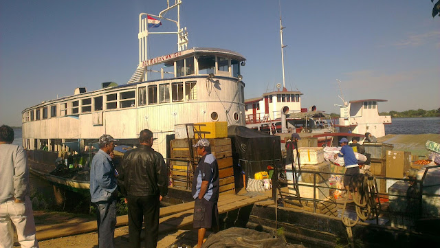 Observar el barco de madera, con su ajetreo de idas y venidas, con sus voces en un guaraní (idioma de los indios guaraníes autóctonos de la cuenca del río Paraguay) que si algo tenía de español era tan sólo lo referente a las cifras..., su bullicio, metiendo y sacando todo tipo de materias primas y materiales: sillas, sofás, tubos para construcción, latas de cerveza (a miles) y así un largo etcétera..., me hizo tener ante mi vista una muestra inequívoca de cómo eran los puertos hace un siglo. Esta vez no era cuestión de echarle imaginación, esta vez lo estaba viviendo!, y además con la inmensa fortuna de que yo era uno de los pasajeros que remontaría el río Paraguay en una hora escasa.